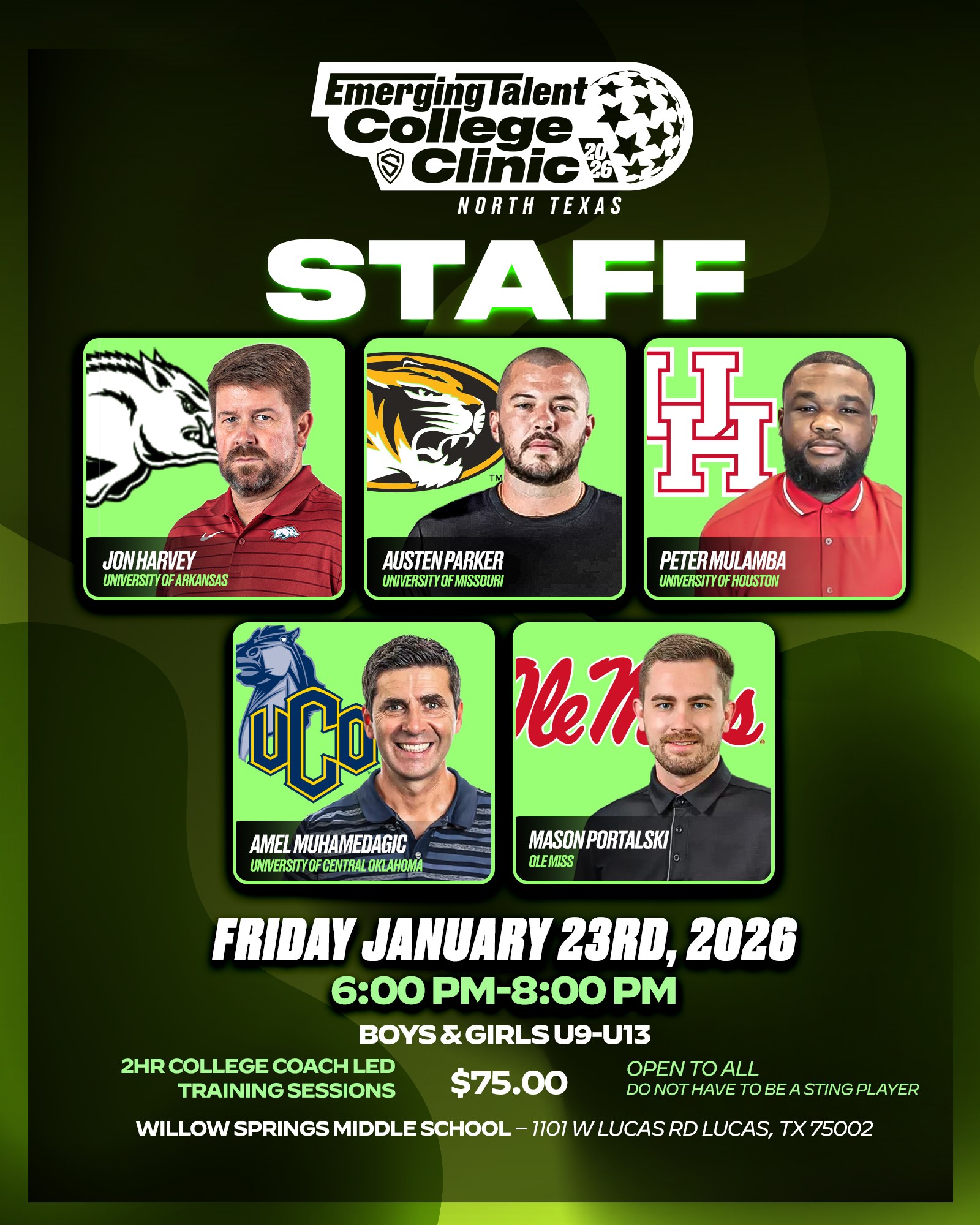 Date: Friday January 23rd, 2026 Time: 6:00 PM-8:00 PM Gender - Boys & Girls U9-U13 (Open to all - do not have to be a Sting Player) Location: Willow Springs Middle School –