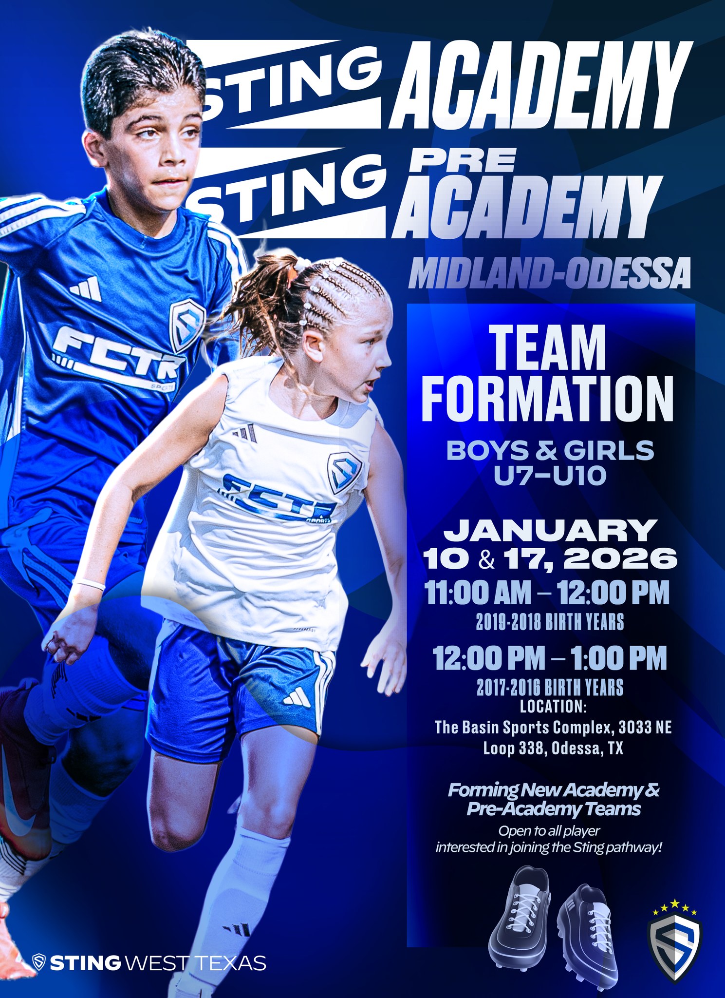 Dates: Jan 17th Age Groups: 2016-2019 Boys & Girls Times: 11:00 AM- 12:00 PM - 2019 & 2018's 12:00 PM - 1:00 PM - 2017 & 2016's Location: The Basin Sports Complex 3033 NE Loop 338, Odessa, TX